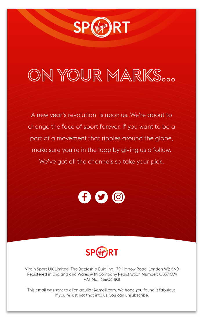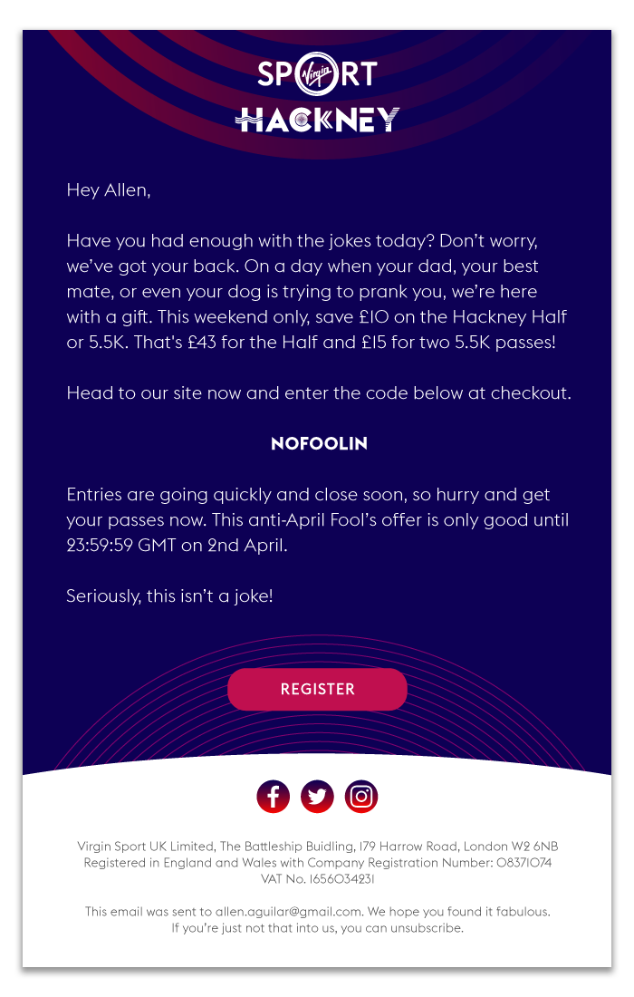 In conjunction with the brand launch, Virgin Sport also opened entries for its inaugural Hackney Festival of Fitness, a rebrand and expansion of Vitality's Run Hackney-one of a handful of races that were acquired by Virgin Sport. As part of the brand's visual expression, each event would encompass a unique gradient and visual identity -Virgin red to purple, in the case of Hackney-to differentiate each festival when presented on the Virgin Sport site. I art directed and wrote social posts focusing largely on customer acquisition; web and product copy for each festival and sub event; and a slew of emails targeting a range of audiences, including those who expressed interest by joining our mailing list, those who registered, those who participated in the race's predecessor, and those who previously volunteered or expressed interest in volunteering.