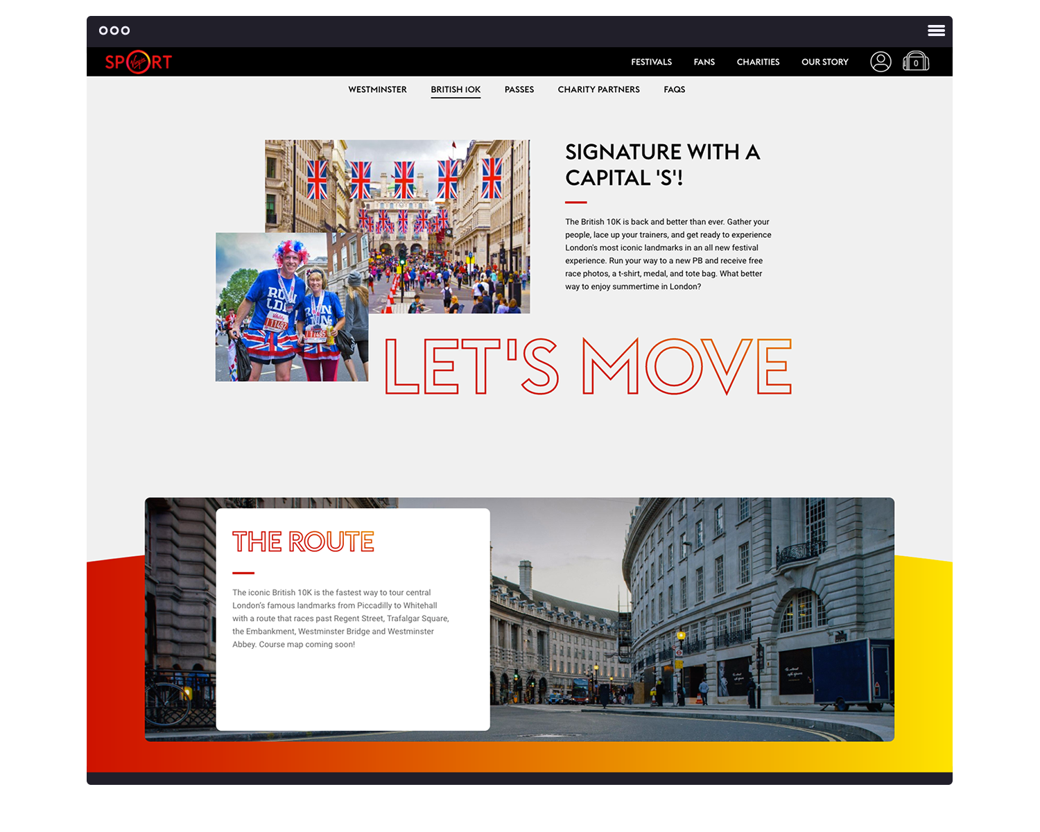 A month after executing Virgin Sport's go-to-market strategy and in the throes of preparing for Hackney, we started building out the Virgin Sport Westminster Festival of Fitness. The team planned for an equally immersive experience in central London that mirrored the festival atmosphere of Hackney, but tighter regulations in Westminster eliminated a planned cycling race and stage for group fitness instructors to offer classes and for musicians to rally spectators. Instead, the legacy British 10K took top billing, but we retained the Westminster Festival of Fitness branding to lay the groundwork for future events.